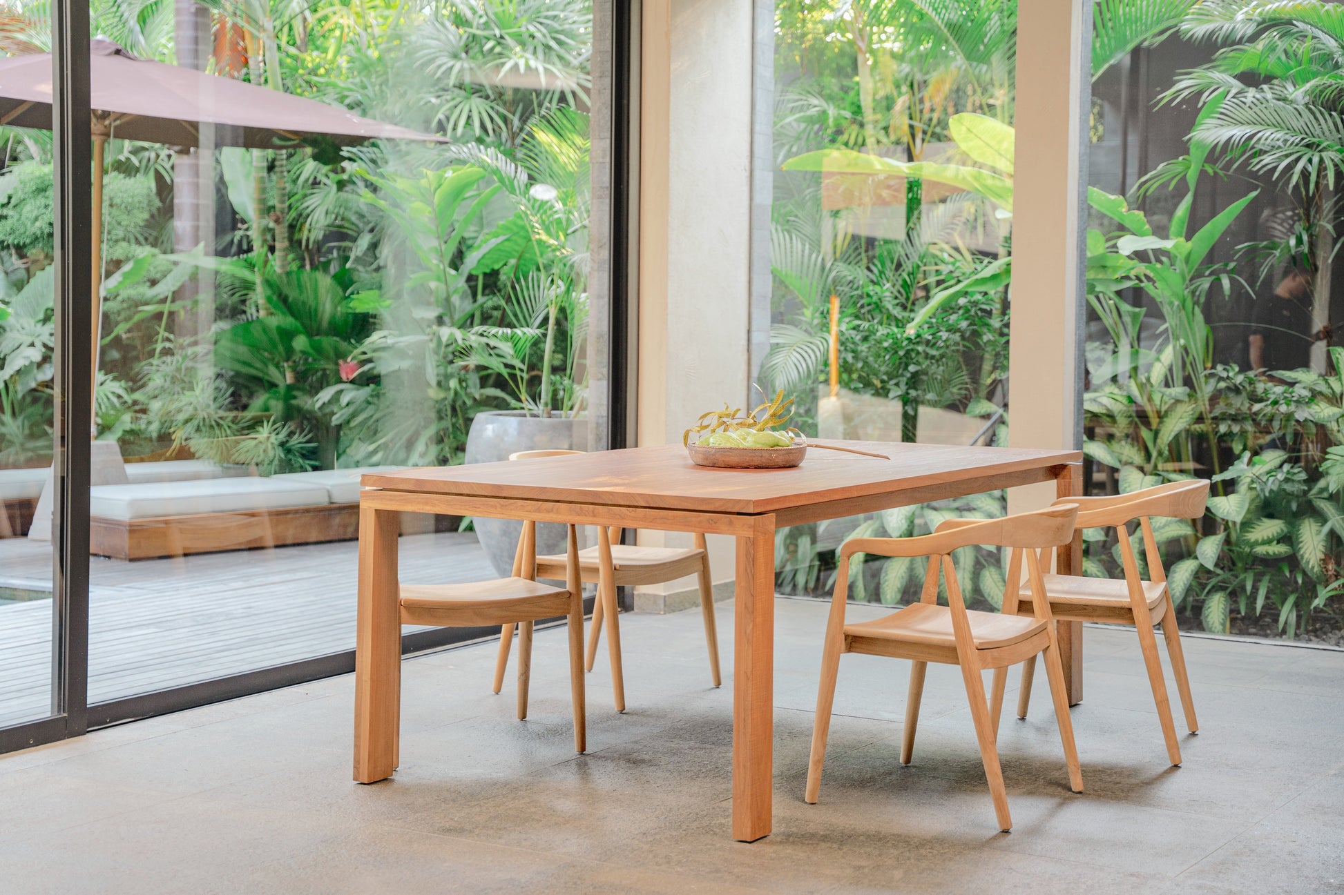 La silhouette minimalista del tavolo Hara mette in risalto la bellezza naturale del legno di teak, le sue venature uniche e la finitura naturale, rendendolo un pezzo versatile che si abbina perfettamente sia agli interni contemporanei che a quelli organici.