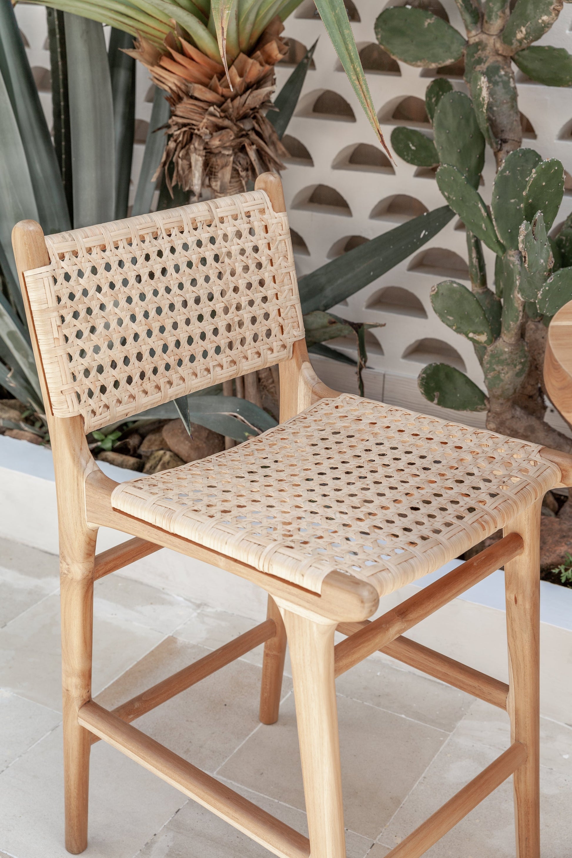 Aggiungi un tocco caldo all'arredamento del tuo bar o della tua cucina con lo sgabello da bar Nadia. La combinazione di legno di teak indonesiano e rattan naturale, e le linee eleganti del design, aggiungono consistenza e donano un tocco naturale a qualsiasi spazio.